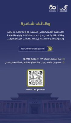 وهج الخليج - مسقط تعلن هيئة الطيران المدني بالتنسيق مع وزارة العمل عن توفر وظائف شاغرة، فعلى من يجد لديه الكفاءة والرغبة لشغلها ومستوفيا للشروط المحددة، أن يتقدم بطلبه عبر البريد الإلكتروني. وظائف هيئة الطيران المدني