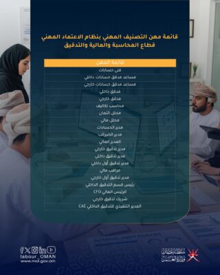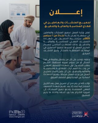 تعلن وزارة العمل لجميع المنشآت والعاملين في سلطنة عُمان بأنه ابتداءً من 1 سبتمبر 2025م، سيُشترط الحصول على شهادة التصنيف المهني للمحاسبة والمالية والتدقيق، وذلك كمتطلب أساسي لإصدار تصاريح العمل أو تجديدها لجميع العاملين في الوظائف المتعلقة بمجال المحاسبة والمالية والتدقيق.