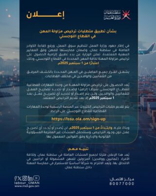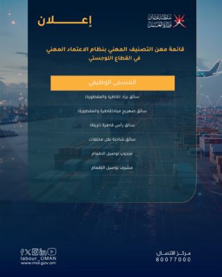 في إطار جهود وزارة العمل لتنظيم سوق العمل، ورفع كفاءة الكوادر العاملة في سلطنة عُمان، وضمان ممارستها للمهن وفق المعايير المهنية المعتمدة، تعلن الوزارة عن بدء تطبيق إلزامية الحصول على ترخيص مزاولة المهنة لكافة المهن المحددة في القطاع اللوجستي، وذلك اعتبارًا من 1 سبتمبر 2025م.