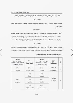 أصدرت شرطة عمان السلطانية قرار بتعديل بعض أحكام اللائحة التنفيذية لقانون الأحوال المدنية استنادا إلى قانون الأحوال المدنية الصادر بالمرسوم السلطاني رقم ٩٩/٦٦ وإلى اللائحة التنفيذية لقانون الأحوال المدنية الصادرة بالقرار رقم ٢٠٠٧/٤٠ وإلى موافقة وزارة المالية وبناء على ما تقتضيه المصلحة العامة