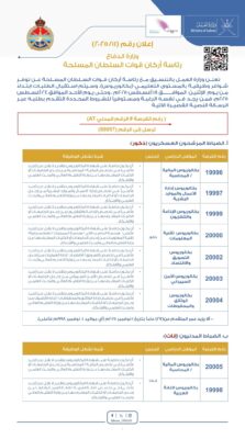 تُعلن ⁧‫وزارة العمل‬⁩ بالتنسيق مع رئاسة أركان قوات السلطان المسلحة عن توفر شواغر بالمستوى التعليمي (البكالوريوس) ، وذلك ابتداءً من اليوم الاثنين الموافق 18 أغسطس 2025م،وحتى يوم الأحد الموافق 24 أغسطس 2025م ،