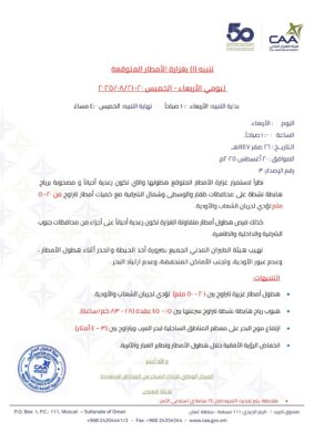 نظراً لاستمرار غزارة الأمطار المتوقع هطولها والتي تكون رعدية أحياناً و مصحوبة برياح هابطة نشطة على محافظات ظفار والوسطى وشمال الشرقية مع كميات أمطار تتراوح من ٢٠-٥٠ ملم تؤدي لجريان الشعاب والأودية .