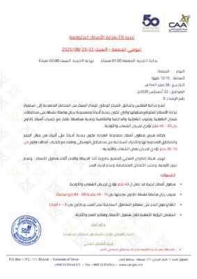 أصدر المركز الوطني للإنذار المبكر من المخاطر المتعددة تنبيهًا باستمرار غزارة الأمطار المتوقع هطولها اليوم، والتي تكون رعدية أحيانًا ومصحوبة برياح هابطة نشطة على محافظات شمال الشرقية وجنوب الشرقية والداخلية والظاهرة وبادية محافظة ظفار، مع كميات أمطار تتراوح بين 40 – 20 ملمترا، تؤدي إلى جريان الشعاب والأودية.