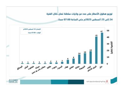 أوضحت وزارة الثروة الزراعية والسمكية وموارد المياه معدل توزيع هطول الأمطار على عدد من ولايات سلطنة عُمان خلال الفترة من 24-25 أغسطس 2025 حتى الساعة 7 مساء .