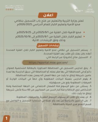 أعلنت وزارة التربية والتعليم عن فتح باب التسجيل بنظام محو الأمية وتعليم الكبار للصفوف (7 – 12) للعام الدراسي 2025/2026 ، وذلك عن طريق موقع البوابة التعليمية، كما حددت الوزارة مواعيد تسجيل طلبات محو الأمية خلال الفترة من 1 -25 سبتمبر 2025، أما تعليم الكبار فيتم استقبال طلبات التسجيل خلال الفترة من 1 سبتمبر حتى 16 أكتوبر 2025.