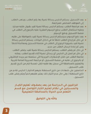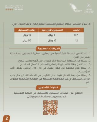 وأوضحت الوزارة أهمية التسجيل بنظامي محو الأمية وتعليم الكبار خلال الفترة المحددة، عبر البوابة التعليمية ويحق للدارس التسجيل في المحافظة المذكورة بالبطاقة الشخصية كعنوان دائم أو في المحافظة التي بها مقر عمله، شريطة إرفاق ما يثبت من جهة العمل، واستثنت الوزارة فئة الضمان الاجتماعي والأشخاص ذوي الإعاقة وكبار السن فوق 60 سنة من دفع الرسوم بشرط إرفاق ما يثبت ذلك من الجهة المختصة، وعلى الراغبين بالدراسة عن بعد التواصل مع قسم التعلم مدى الحياة.