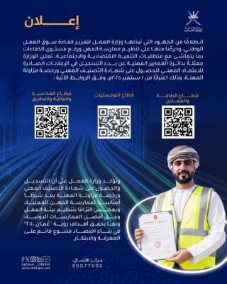 أعلنت وزارة العمل عن بدء تطبيق متطلبات تراخيص مزاولة عدة مهن، لذا يتوجب على جميع العاملين لدى المنشآت أو المزمع تعيينهم في تلك المهن التقدم إلى الجهة المعنية ( الجمعية العُمانية للطاقة ممثلة بوحدة المهارات القطاعية لقطاع الطاقة والمعادن لاستكمال إجراءات تراخيص مزاولة المهن، وذلك كشرط أساسي لإصدار أو تجديد تصاريح العمل.