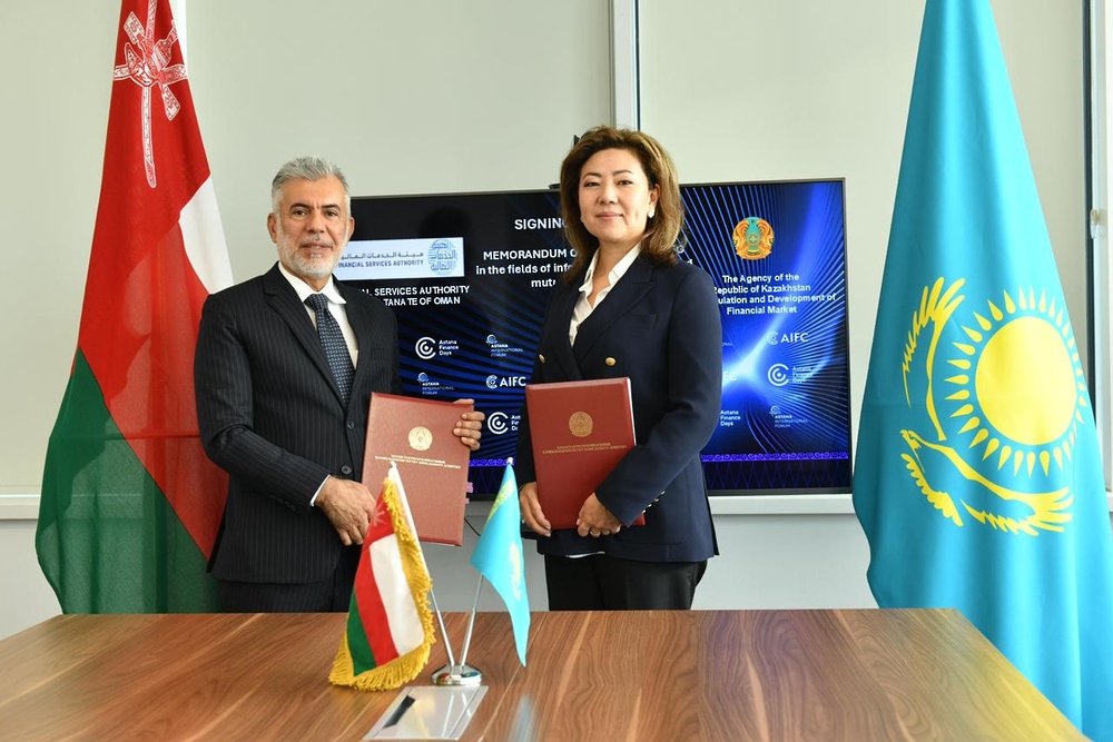 وقّعت سلطنة عُمان وجمهورية كازاخستان على مذكرة تفاهم لتعزيز التعاون في مجال التنظيم المالي وتبادل الخبرات وتطوير البنية الأساسية للسوق المالي على هامش أعمال مؤتمر أستانا المالي الذي عُقد في العاصمة الكازاخستانية أستانا بمشاركة الجهات التنظيمية وواضعي السياسات وقادة المال لمناقشة مستقبل أسواق رأس المال.