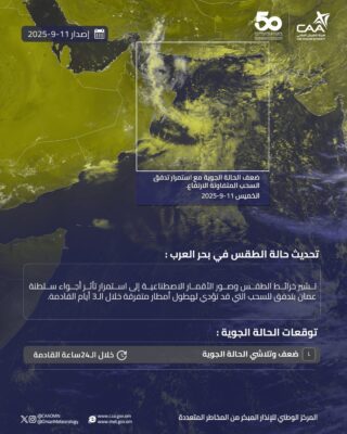 ذكرت الأرصاد الجوية العمانية عبر حسابها الرسمي على منصة “اكس” أن خرائط الطقس وصور الأقمار الاصطناعية تشير إلى استمرار تأثر أجواء سلطنة عمان بتدفق للسحب التي قد تؤدي لهطول أمطار متفرقة خلال الـ 3 أيام القادمة.