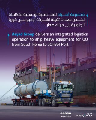 نجحت مجموعة أسياد في تنفيذ عملية شحن معقدة متكاملة، من كوريا الجنوبية إلى ميناء صحار، لحمولة معدات ثقيلة ضخمة تابعة لشركة أوكيو للمصافي والصناعات البترولية، إحدى شركات مجموعة #أوكيو، وزنها الاجمالي 214.9 طن، مكونة من وحدتين بطول 15 مترًا لكل منهما ، باستخدام حلول هندسية مبتكرة وفق أعلى معايير السلامة.