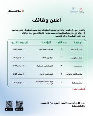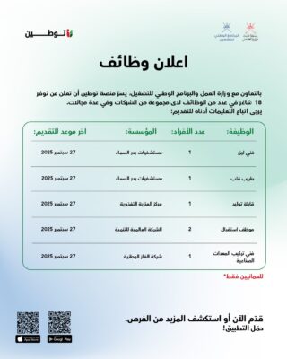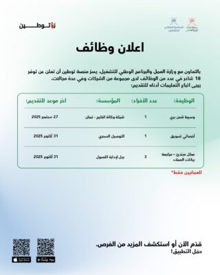 وهج الخليج ـ مسقط بالتعاون مع وزارة العمل والبرنامج الوطني للتشغيل، يسرّ منصة توطين أن تعلن عن توفر 18 شاغر في عدد من الوظائف لدى مجموعة من الشركات وفي عدة مجالات.