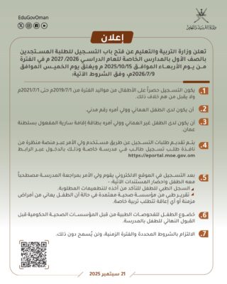 تعلن وزارة التربية والتعليم عن فتح باب التسجيل للطلبة المستجدين بالصف الأول بالمدارس الخاصة للعام الدراسي /20272026 م في الفترة من يوم الأربعاء الموافق 2025/10/15م ويغلق يوم الخميس الموافق 9/7/2026 ، وفق الشروط الموضحة ادناه :
