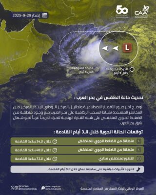 منخفض جوي يقترب من شمال شرق بحر العرب وسط نشاط للسحب الركامية