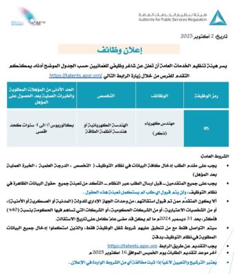 وهج الخليج ـ مسقط أعلنت هيئة تنظيم الخدمات العامة عن توفر شاغر وظيفي (مهندس كهرباء). تجدون التفاصيل في الإعلان المرفق، للتقديم عبر الرابط: https://mol.gov.om/job?s=09