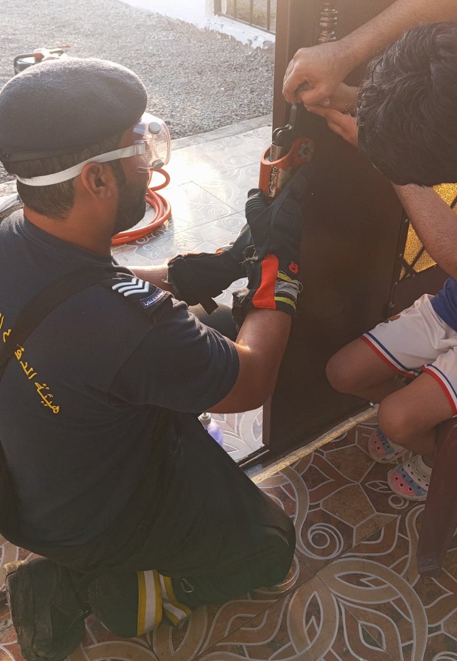تعاملت فرق الإنقاذ بإدارة الدفاع المدني والإسعاف بمحافظة شمال الباطنة مع بلاغ ورد إلى مركز عمليات الهيئة حول احتجاز يد طفل في الباب الخارجي لأحد المنازل بولاية صحار ،وقد باشرت الفرق مهامها على الفور، وتم تحرير يد الطفل، وهو بصحة جيدة.