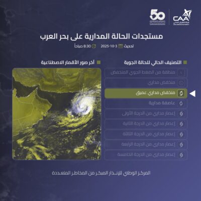 وهج الخليج - مسقط توضح آخر صور الأقمار الاصطناعية وتحاليل المركز الوطني للإنذار المبكر من المخاطر المتعددة إلى تطور المنخفض المداري إلى منخفض مداري عميق .