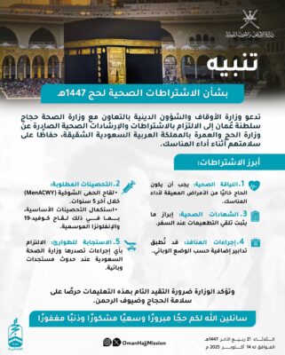 اشتراطات صحية إلزامية لحجاج سلطنة عُمان لموسم 1447هـ