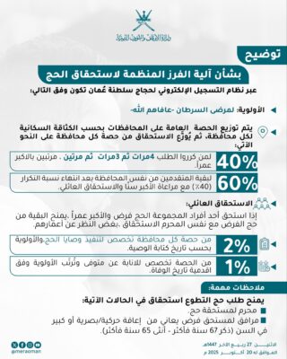 توضح وزارة الأوقاف والشؤون الدينية آلية الفرز المنظمة لاستحقاق ‎الحج عبر نظام التسجيل الإلكتروني لحجاج سلطنة عُمان تكون وفق التالي