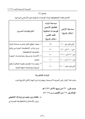 أصدرت وزارة الإسكان والتخطيط العمراني قرار وزاري بتعديل بعض أحكام اللائحة التنظيمية لضوابط تخطيط الأراضي
