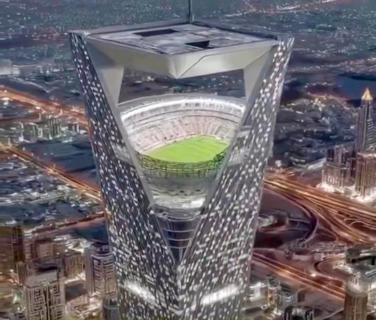 انتشر فيديو لملعب كرة قدم ضخم فوق ناطحة سحاب، قدّمه مستخدمو الإنترنت ووسائل إعلام على أنه أحد الملاعب المستقبلية لكأس العالم 2034 المقررة في السعودية، وأثار ضجة عالمية، ليتضح أن لا علاقة له بهذا المشروع. وعلى غرار مقاطع الفيديو التي تُنتج الآن في دقائق باستخدام الذكاء الاصطناعي، حقق هذا الفيديو نجاحا يتناسب مع الشعبية العالمية لكرة القدم، خاصة أنه ظهر قبل تسع سنوات من الحدث العالمي، وحيث لا يزال أكثر من اثني عشر ملعبا مجرد خطط ونماذج.