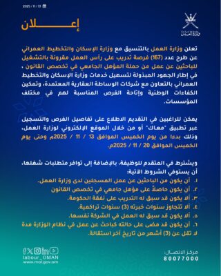 تُعلن وزارة العمل بالتنسيق مع وزارة الإسكان والتخطيط العمراني عن طرح عدد (167) فرصة تدريب على رأس العمل مقرونة بالتشغيل للباحثين عن عمل من حملة المؤهل الجامعي في تخصص القانون.