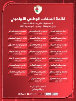 وهج الخليج ـ مسقط نشر المنتخب العماني عبر حسابه الرسمي على منصة اكس قائمة المنتخب الوطني الأولمبي في المعسكر الداخلي بمحافظة مسقط كما هو موضح أدناه