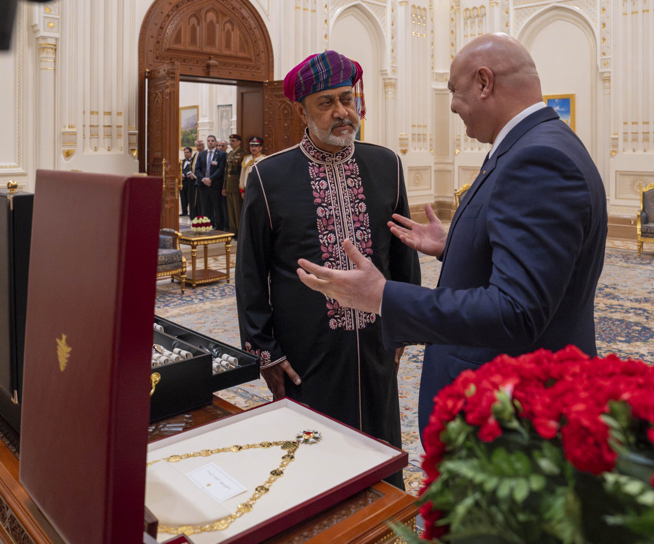 جلالة السلطان يتبادل الأوسمة والهدايا مع رئيس لبنان في مأدبة قصر العلم