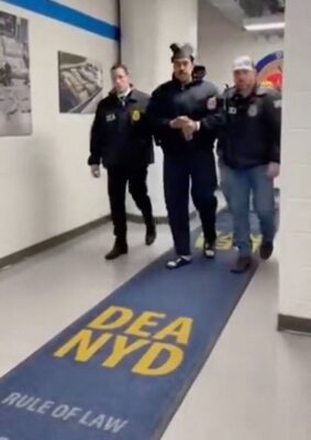 وأفاد الجنرال كاين بأن “مادورو وزوجته، وكلاهما متهمان، استسلما من دون مقاومة ووُضعا قيد الاحتجاز من قبل وزارة العدل”. ويلاحق القضاء الأميركي الزوجين في اتهامات تتعلق بـ”الإرهاب المرتبط بالمخدرات”، وتصدير الكوكايين إلى الولايات المتحدة. وحلّقت المروحيات الأميركية فوق الساحل الفنزويلي عند الساعة 03,29، ونُقل الزوجان إلى السفينة الحربية “يو إس إس إيوو جيما” ثم أعلن ترامب العملية على منصته “تروث سوشال” عند الساعة 04,21 بتوقيت واشنطن. وبعد ذلك بقليل، بعث مسؤول في البيت الأبيض إلى صحافي في وكالة فرانس برس رسالة مؤلفة من رموز “إيموجي” تعبيرية، هي عبارة عن عضلة مشدودة وقبضة ونار. ثم نشر ترامب أول صورة لنيكولاس مادورو مكبّل اليدين ومعصوب العينين وعلى أذنيه سماعة واقية من الضوضاء.
