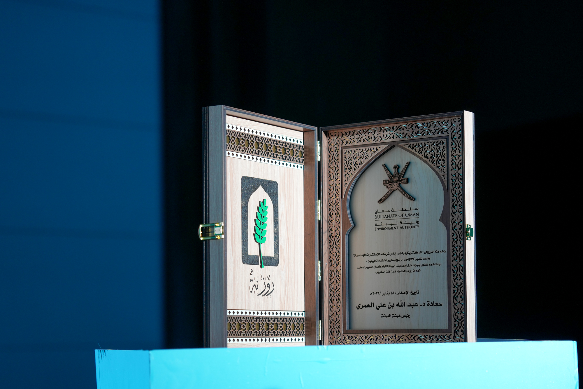 ومنحت إلى (مكتب شركة رينارديه إس إيه وشركاه للاستشارات الهندسية ش.م.م)، تقديرًا لاعتمادهم كأول جهة تدقيق مرخّصة من قبل هيئة البيئة للقيام بأعمال التقييم لمعايير شهادات روزنة الخضراء ضمن فئة المشاريع.