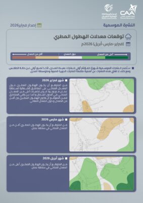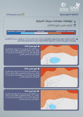 ذكرت الأرصاد الجوية العمانية عبر حسابها الرسمي على منصة اكس التوقعات الموسمية للشهر الحالي والأشهر القادمة(فبراير-مارس-أبريل) 2026 م