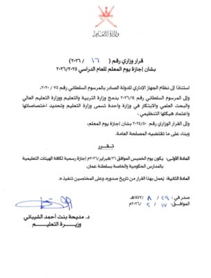 أصدرت وزارة التعليم القرار الوزاري رقم (16 / 2026) بشأن إجازة يوم المعلم للعام الدراسي 2026/2025، وينص القرار على أن يكون يوم الخميس الموافق 2026 إجازة رسمية لكافة الهيئات التعليمية في المدارس الحكومية والخاصة بسلطنة عمان، ويعمل بهذا القرار من تاريخ صدوره، ويلزم المختصون بتنفيذه.