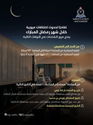 ودعت سائقي الشاحنات إلى الالتزام بالمواعيد المحددة والتعاون مع الجهات المختصة، بما يسهم في تعزيز السلامة المرورية وضمان سلاسة الحركة خلال الشهر الفضيل.