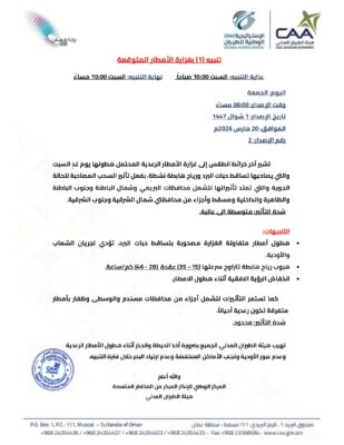 تشير آخر خرائط الطقس إلى غزارة الأمطار الرعدية المحتمل هطولها يوم غد السبت والتي يصاحبها تساقط حبات البرد ورياح هابطة نشطة، بفعل تأثير السحب المصاحبة للحالة الجوية والتي تمتد تأثيراتها لتشمل محافظات البريمي وشمال الباطنة وجنوب الباطنة والظاهرة والداخلية ومسقط وأجزاء من محافظتي شمال الشرقية وجنوب الشرقية.