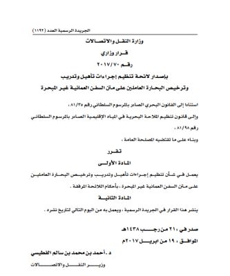 أصدرت “وزارة النقل والإتصالات” قرارً وزارياً رقم 2017/70، بإصدار لائحة تنظيم إجراءات تأهيل وتدريب وترخيص البحارة العاملين على متن السفن العمانية غير المبحرة.