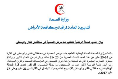 أصدرت “وزارة الصحة” بيان حول تمديد فترة الحملة الوطنية للتحصين ضد مرض الحصبة في محافظتي ظفار والوسطى.