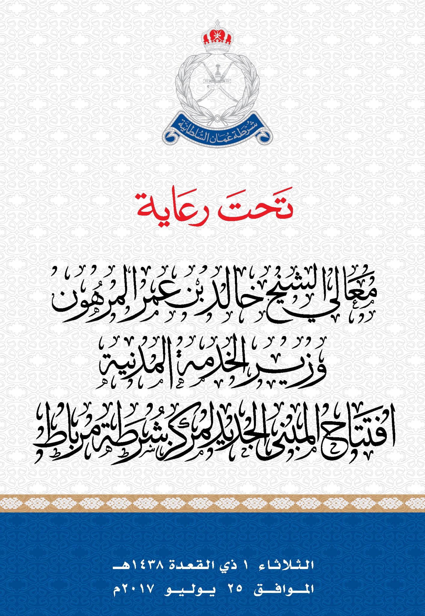 تحتفل شرطة عمان السلطانية الثلاثاء القادم ، بإفتتاح المبنى الجديد لمركز شرطة مرباط بظفار، وذلك تحت رعاية معالي الشيخ خالد بن عمر المرهون وزير الخدمة المدنية .