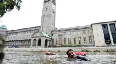 ويضع أغراضه الشخصية كـ الحاسب الآلي ( اللابتوب ) و ملابس العمل في حقيبة ضد الماء ، ويسبح مرتديا زي السباحة المناسب في مياه نهر إيسار.