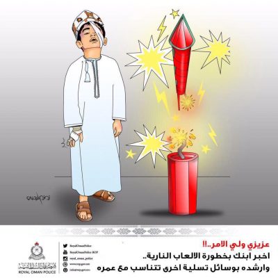وتحذر شرطة عمان السلطانية من مخاطر ترويج واستخدام الألعاب النارية، نظراً إلى مخاطر استخدامها لاسيما من قِبل الأطفال فهي قد تصيب الجسم بحروق أو جروح، كما أنها من الممكن أن تتسبب في اندلاع الحرائق.