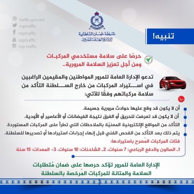 حرصاً من شرطة عمان السلطانية على سلامة مستخدمي المركبات ومن أجل تعزيز السلامة المرورية، فقد نشرت شروط استيراد المركبات من خارج السلطنة، وطريقة التأكد من سلامة المركبات.