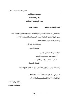 صدر في الجريدة الرسمية ليوم الثلاثاء الموافق 5/8/2017 مرسوم سلطاني رقم ٢٠١٧/٤١. والذي يقضي برد الجنسية العمانية لشخصين. حيث جاء المرسوم كالتالي: