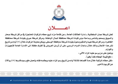تعلن شرطة عمان السلطانية ممثلة بإدارة العلاقات العامة عن إقامة مزاد لبيع حطام المركبات المحتجزه في مراكز شرطة صحاروالسويق وصحم وشناص، وساحة مبنى قيادة شرطة محافظة شمال الباطنة.