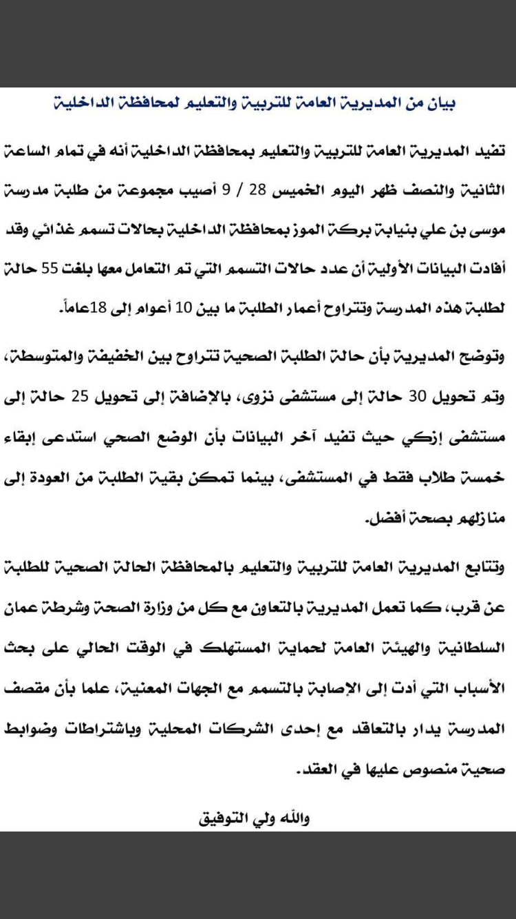 أصيب عدد من طلاب مدرسة موسى بن علي بنيابة بركة الموز في محافظة الداخلية بالتسمم الغذائي، حيث بلغ عددهم ما يقارب الـ50 طالبا ، تراوحت أعمارهم بين 10و18 عاما.