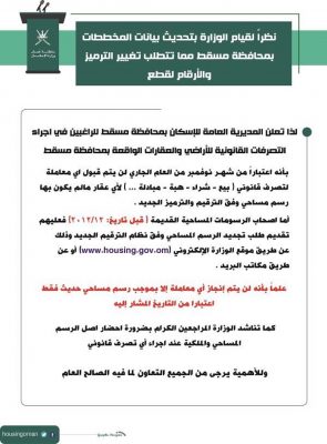 ‏اعتباراً من نوفمبر المقبل، وزارة الإسكان لن تقبل أي معاملة لأي عقار في محافظة ⁧‫مسقط‬⁩ مالم يكن بها رسم مساحي وفق الترقيم والترميز الجديد.