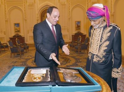 وقبيل حفل العشاء تبادل حضرة صاحب الجلالة السلطان قابوس بن سعيد المعظم – أيده الله – وفخامة الرئيس عبد الفتاح السيسي رئيس جمهورية مصر العربية الهدايا التذكارية بمناسبة زيارة فخامته للسلطنة.