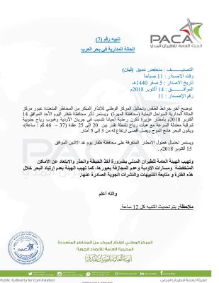 و تهيب الهيئة العامة للطيران المدني بالجميع ضرورة أخذ الحيطة والحذر وعدم المجازفة بعبور الأودية والابتعاد عن الأماكن المنخفضة، كما تهيب الهيئة بعدم ارتياد البحر خلال هذه الفترة ومتابعة النشرات الجوية والتقارير الصادرة عنها.