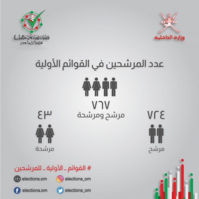 وبلغ إجمالي عدد المرشحين 767 مرشح ، منهم 724 مرشح و 43 مرشحة.