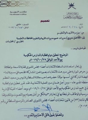 وزارة التربية والتعليم تُصدر قرار بـ تعطيل دوام الطلبة بالمدارس الحكومية يوم الأحد 27-10-2019 وذلك لإتاحة المجال للهيئات التدريسية والإدارية والوظائف المرتبطة بها المشاركة في انتخابات مجلس الشورى .