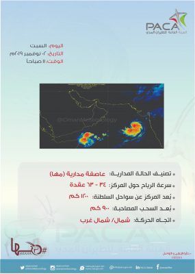 كما وتشير المستجدات الى استمرار تحرك العاصفة المدارية مها باتجاه الشمال الى الشمال الغربي؛ حيث تتراوح سرعة الرياح حول المركز بين (34-63) عقدة ويبعد المركز عن سواحل السلطنة حوالي 1200 كلم.
