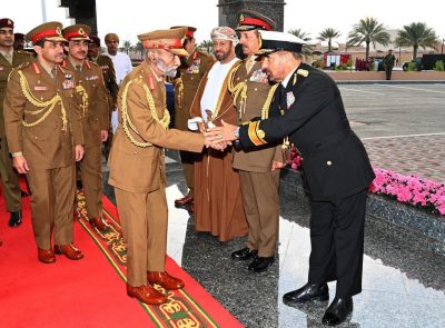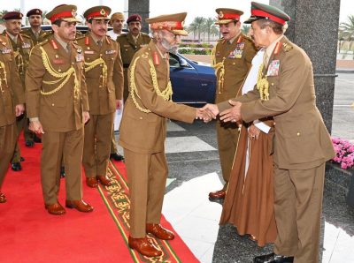 ‏ولدى وصول جلالته ـ حفظه الله ورعاه ـ إلى ميدان الاستعـراض تشـرف باستقبال جلالته – أبقاه الله – معالي الفريق أول وزير المكتب السلطاني ومعالي السيد الوزير المسؤول عن شؤون الدفاع والفريق الركن رئيس أركان قوات السلطان المسلحة واللواء الركن بحري قائد البحرية السلطانية العمانية