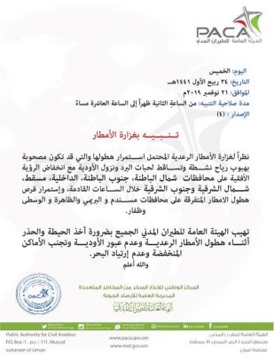 وهج الخليج-مسقط الهيئة العامة للطيران المدني تنبيه بغزارة الأمطار المتوقعة خلال الساعات القادمة على محافظات السلطنة الشمالية .